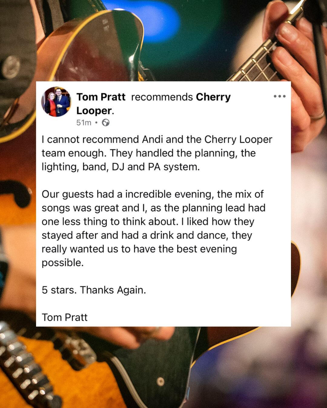 We're pro musicians, we look after the details, and we're good to work with.